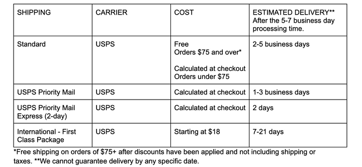 Enjoy free shipping* on domestic orders over $75*. Please note that all orders, even with expedited shipping, still require a processing time of 5-7 business days as most items, except for the One-of-a-Kind collection, are handmade to order. Choosing a faster shipping option only increases the speed of shipping, not the time it takes us to make your items.